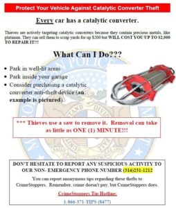 Throughout 2021, catalytic converter thefts have been on the rise throughout the city and county. Toyota Prius and Honda Element models, along with vehicles like vans, SUVs and buses that are easier for thieves to get under, are being hit most often. Police recommend parking in a well-lit area or garage, if possible.